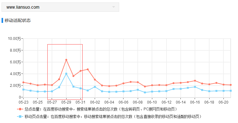 上圖我標記出來的地方就是移動適配出現了大幅度的波動,所在那幾天我的網站流量波動的非常厲害,所以每天看看移動適配的波動大不大,如果發現昨天和當天上升幅度很大,一定要搞清楚這兩天做了哪些操作,然后去準備應對大幅度下降的可能。